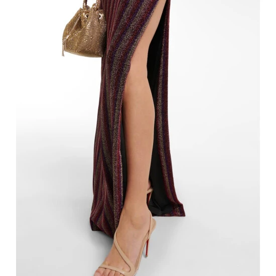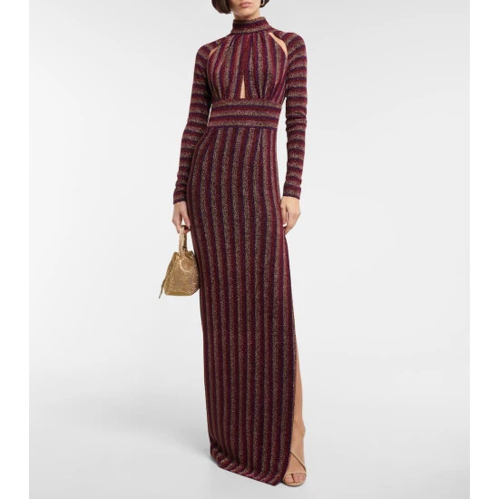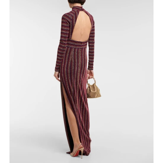Rebecca Vallance’s Aisha gown is the ideal piece for your next festive event. Knitted from metallic yarn with a multicolored striped motif, the high-neck style features a daring open back and strategically placed cutouts.