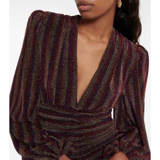 Rebecca Vallance’s Aisha minidress has a shimmery, figure-hugging bodice featuring a plunging V-neck. The ruched miniskirt fits tight against the body and contrasts well with the voluminous blouson sleeves.