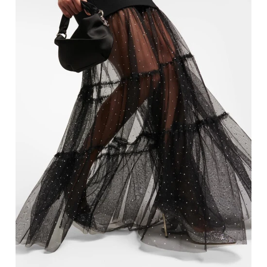 Make a glamorous entrance with the Alyssa gown from Rebecca Vallance. The strapless style has a fitted bodice that extends into a delicate tiered tulle skirt embellished with crystals.