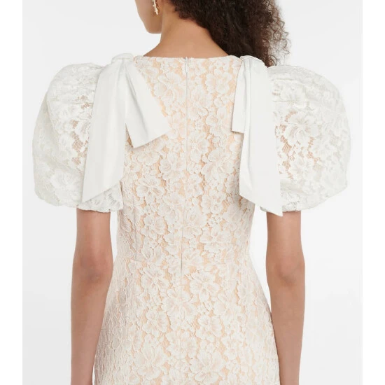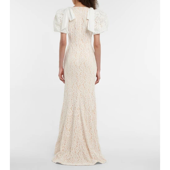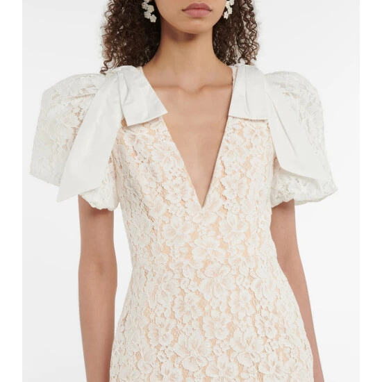 Rebecca Vallance’s Floria gown is designed to make the bride feel her best on the big day. The floral lace design has deep V-neckline, puff sleeves, bow details, and a mermaid hem.