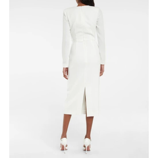 The Phoebe midi dress from Rebecca Vallance combines structured detailing with an elegantly swept wrap-style bodice. A darted pencil skirt, zippered sleeves, and padded shoulders complete the refined design.