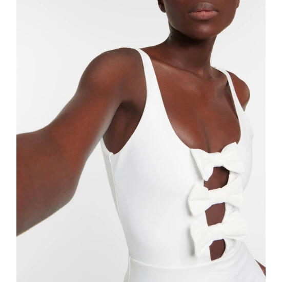 The Elena Bow one-piece swimsuit from Rebecca Vallance combines the brand’s signature bows, daring cutouts, and a low scoop back for an unforgettable look. This piece comes unpadded but fully lined and has moderate coverage.
