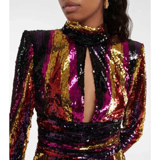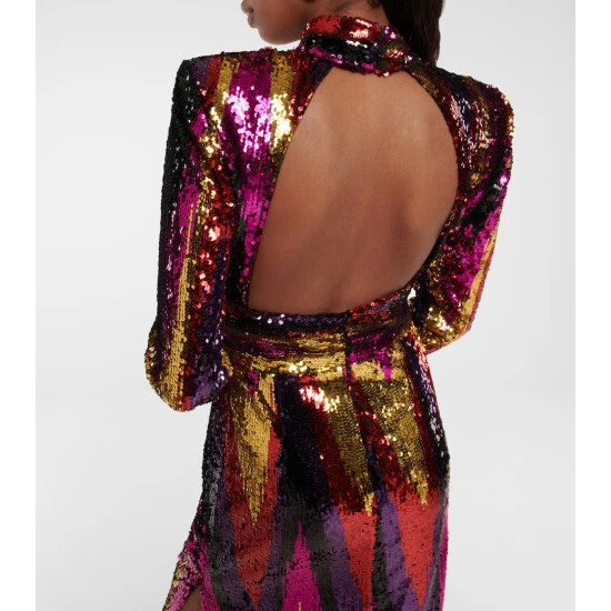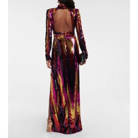 For the vintage-loving maximalist, the sequined Kaia gown from Rebecca Vallance checks all the boxes. The fitted bodice has a keyhole neck and an open back and the column skirt has a dramatic leg slit.