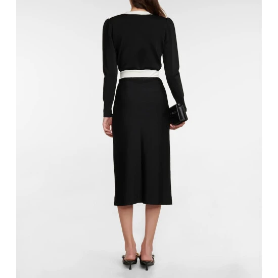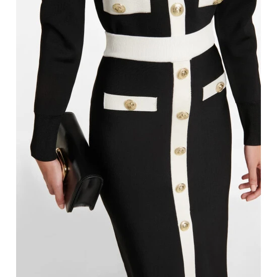 This Rebecca Vallance midi skirt is knitted from lightweight jet black yarns with contrast white details, an elasticated waist, and gold-toned embossed buttons.