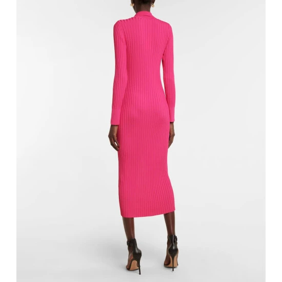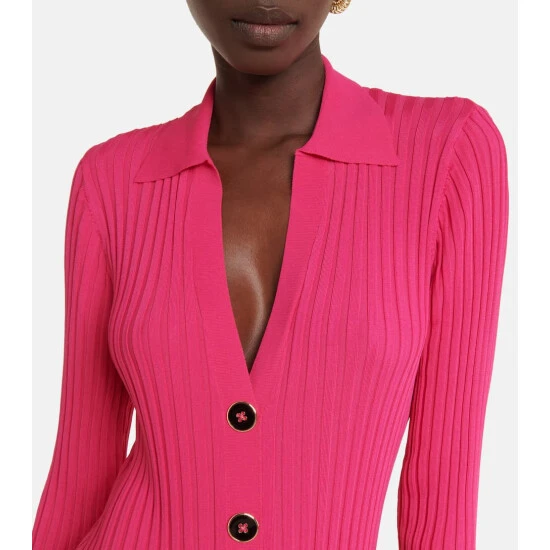 Rebecca Vallance’s Leigh dress is one of those wear-anytime pieces. Shaped into a fitted silhouette, the ribbed-knit design has a buttoned front and a plunging neckline.
