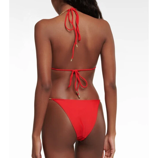 Male a glamorous appearance at the poolside with the Maite Chain bikini top Rebecca Vallance. It has a triangle silhouette with golden chainlink details and removable padding.