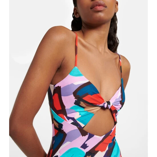 Made from a stretchy swim fabric with a watercolor-style print, Rebecca Vallance’s Malaga swimsuit has a cutout at the chest and offers medium coverage.