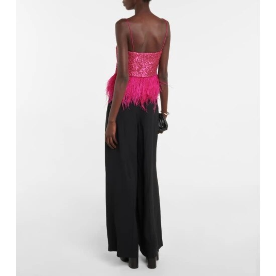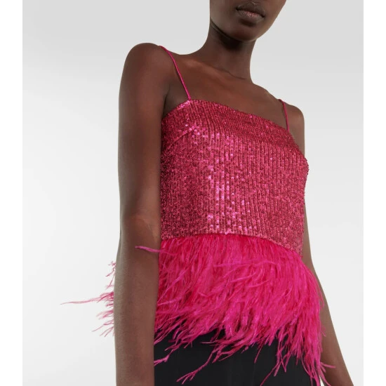 Make a stop-and-stare entrance in the Mytheresa-exclusive Missing Hours top from Rebecca Vallance. It’s saturated in sequins, trimmed with plush feathers at the cropped hemline, and anchored with barely-there spaghetti straps.