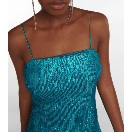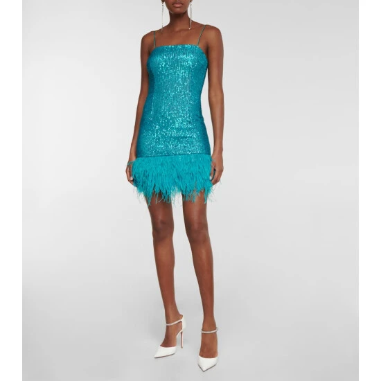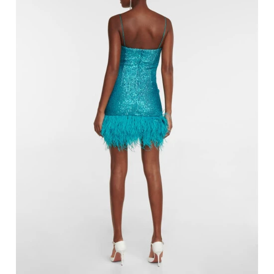 Rebecca Vallance’s Missing Hours minidress will make you stand out everyone you go. Trimmed with feathers, this sequined design has a square neckline and wispy shoulder straps.