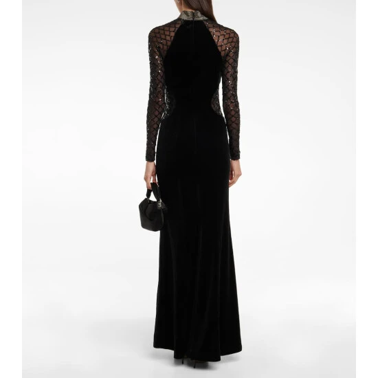 Rebecca Vallance was inspired the daring styles of the roaring ‘20s to create the Onyx gown. This show-stopping piece features sheer fishnet details at both sleeves and either side of the waistline and a rhinestone-embellished high-neckline.