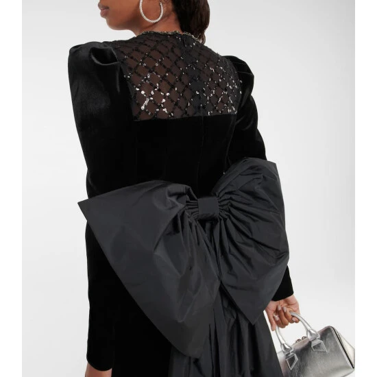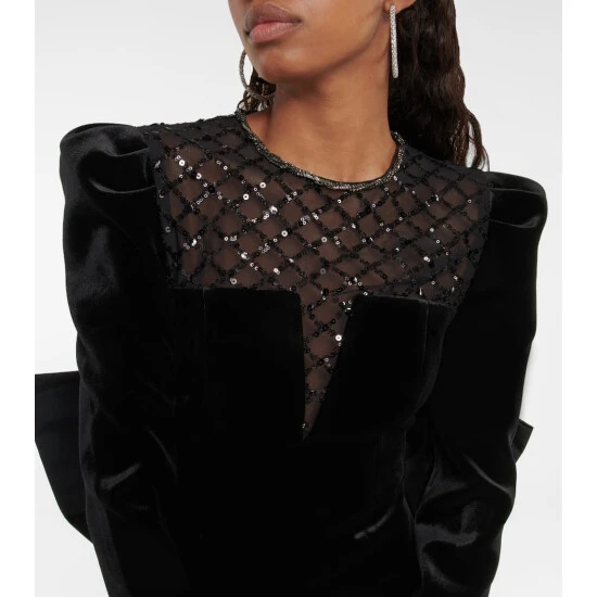 The Onyx velvet minidress from Rebecca Vallance turns heads with its sequined sheer detailing and structured shoulders. The brand signature taffeta bow on the back balances out this otherwise top-heavy design.