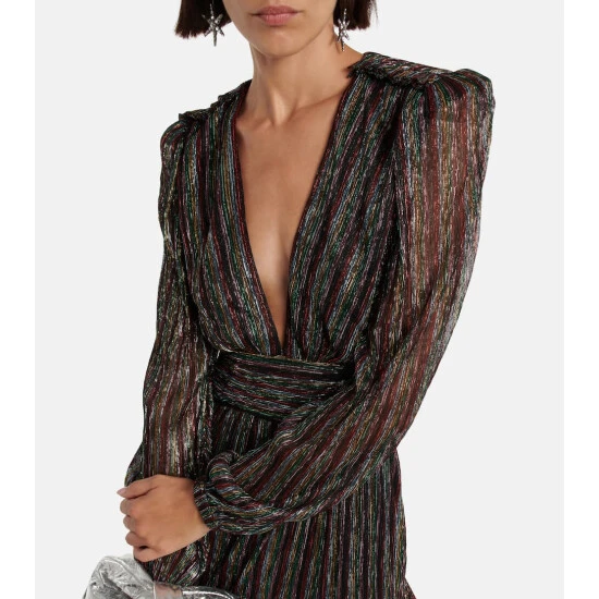 Bring some sparkle to your next event with Rebecca Vallance’s Ronnie minidress. Knitted from sparkly Lurex®, this multicolored, striped design has blouson sleeves, a plunging neck, and a daring cutout at the back.
