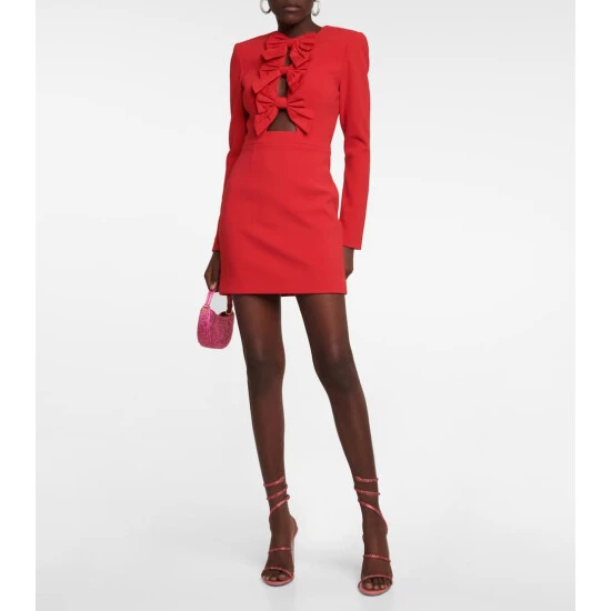 You’re sure to make an unforgettable entrance in Rebecca Vallance’s Scarlett minidress. Shaped to fit the figure, it’s tailored with sculpting, vertical darting, and is defined by taffeta bows at the alluring front cutouts.