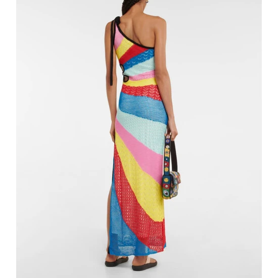 Be party-ready with the multicolored Alpes maxi dress from Staud. It’s made from an intarsia pointelle and features cutouts at the waist and a self-tie shoulder strap.