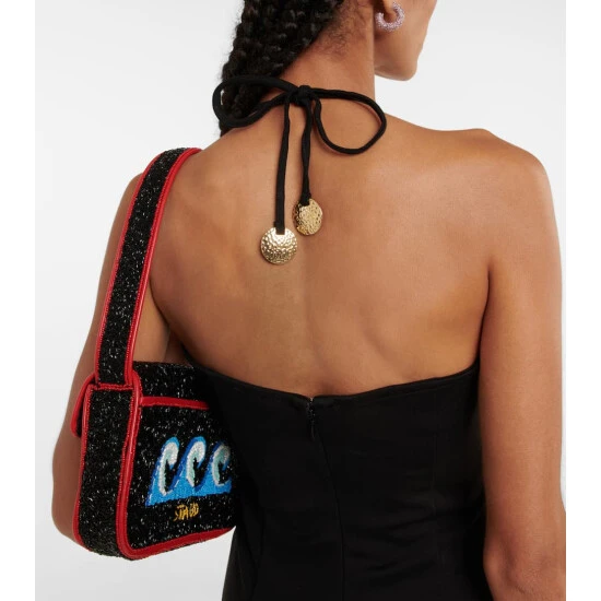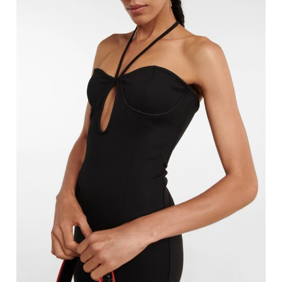 Staud’s Bardot midi dress hugs the figure before seguing into a light flare at the knees. Made from brand-signature ponte fabric, it features molded cups, a keyhole cutout, back slit, and medallion-embellished halter neckties.