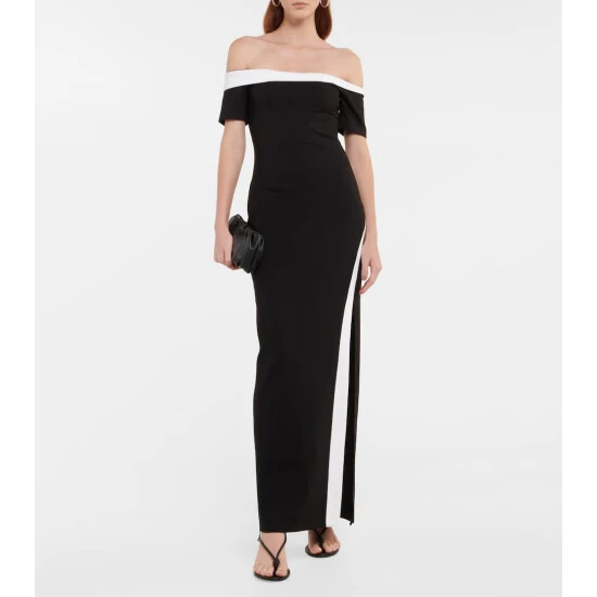 Opt for eveningwear with a modern twist like Staud’s Gabriel maxi dress. It has an off-shoulder silhouette with a thigh-high slit and contrasting trims.