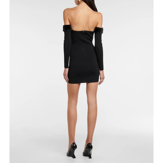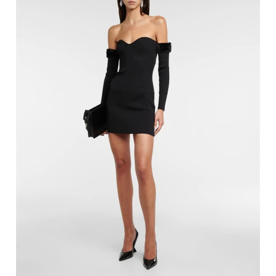 A modern iteration of the little black dress, Staud’s Josee minidress is made from a stretchy rib-knit to a curve-hugging fit, and features a heart neckline and off-shoulder long sleeves trimmed in tonal faux fur.