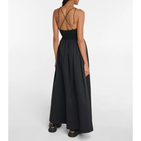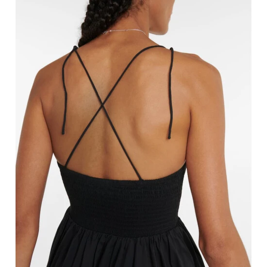 For easy elegance from shore to soirée, look to Staud’s Landry midi dress. Cut from black cotton, it’s designed with spaghetti-style straps and a smocked, corset-inspired bodice that segues into a pleated, flared skirt.