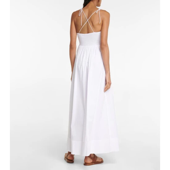 For easy elegance from shore to soirée, look to Staud’s Landry midi dress. Cut from white cotton, it’s designed with spaghetti-style straps and a smocked, corset-inspired bodice that segues into a pleated, flared skirt.