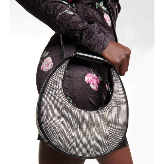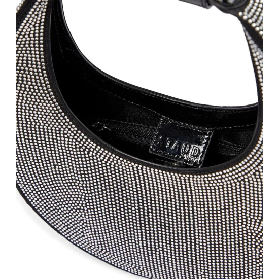 Coated in shimmering crystals, this Mini crossbody bag from Staud has a crescent moon silhouette and hangs from a detachable crossbody strap.